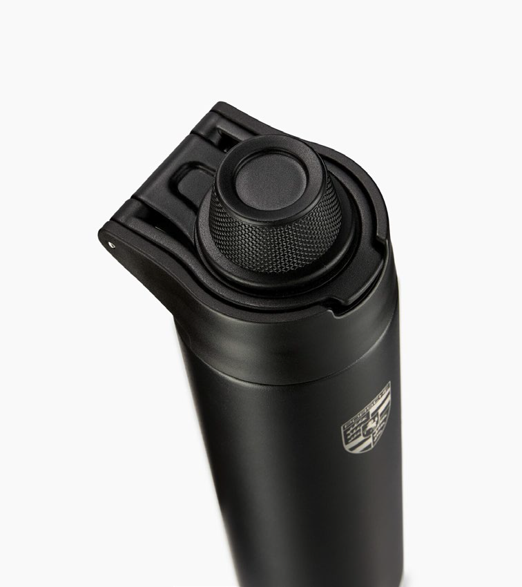 Des performances à emporter : la bouteille isotherme Porsche, à double paroi et 100 % étanche, avec revêtement en poudre noir, garde les boissons chaudes bien au chaud et les boissons froides bien au frais. Le corps est orné d’un blason Porsche gravé au laser. Le couvercle se distingue particulièrement par son design, inspiré du bouton Drive Mode d’un volant Porsche.