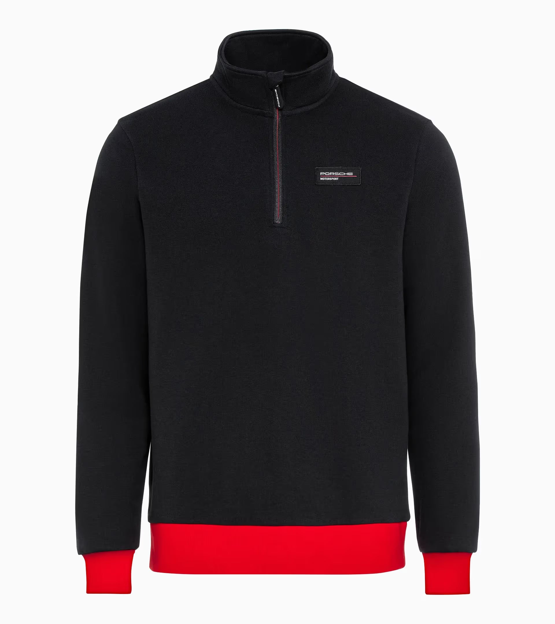 Esprit de course, design élégant et qualité réunis dans une seule collection – avec Motorsport Fanwear. Le pull zippé durable est composé à 80 % de coton biologique et à 20 % de polyester recyclé. L'étiquette Porsche Motorsport cousue sur la poitrine gauche et l'inscription Porsche sur l'ourlet au dos du pull ajoutent des touches particulières. Les zips contrastés sur le devant du col sont un détail sophistiqué.