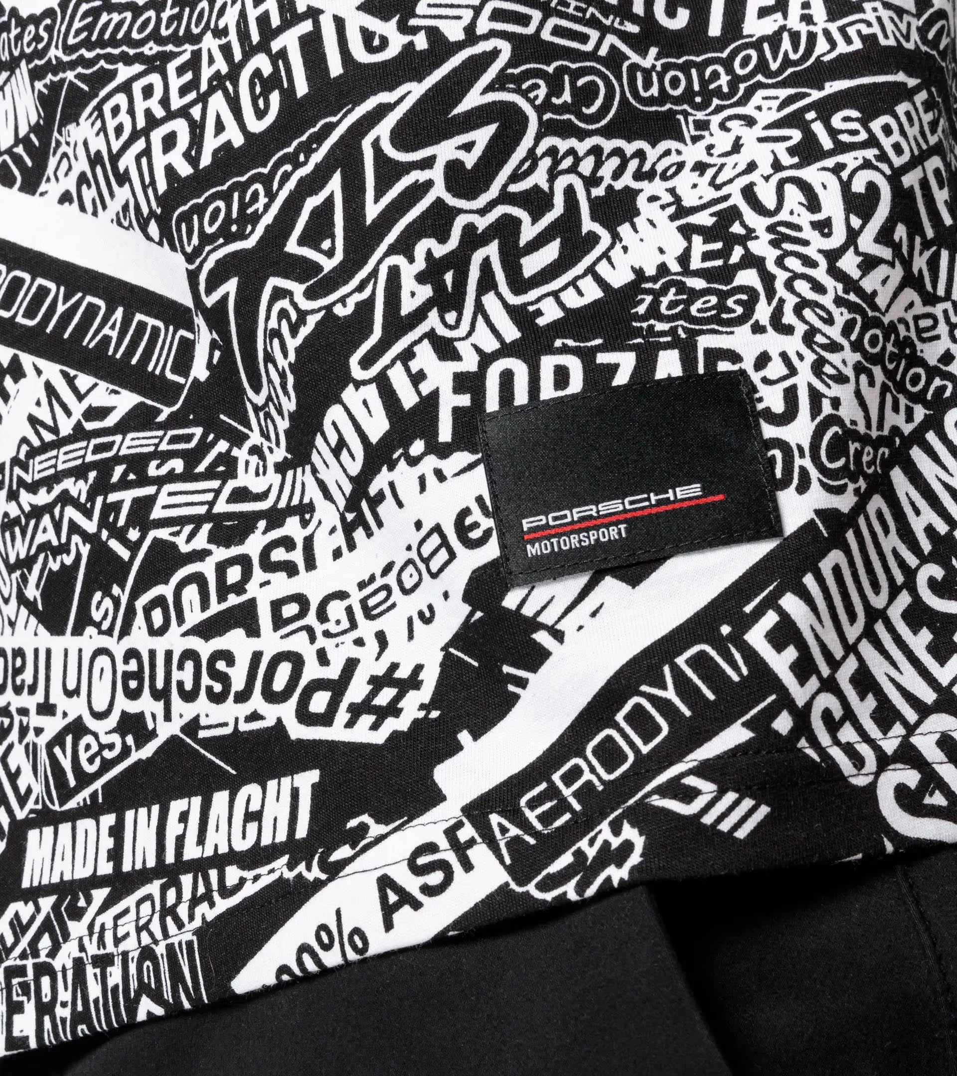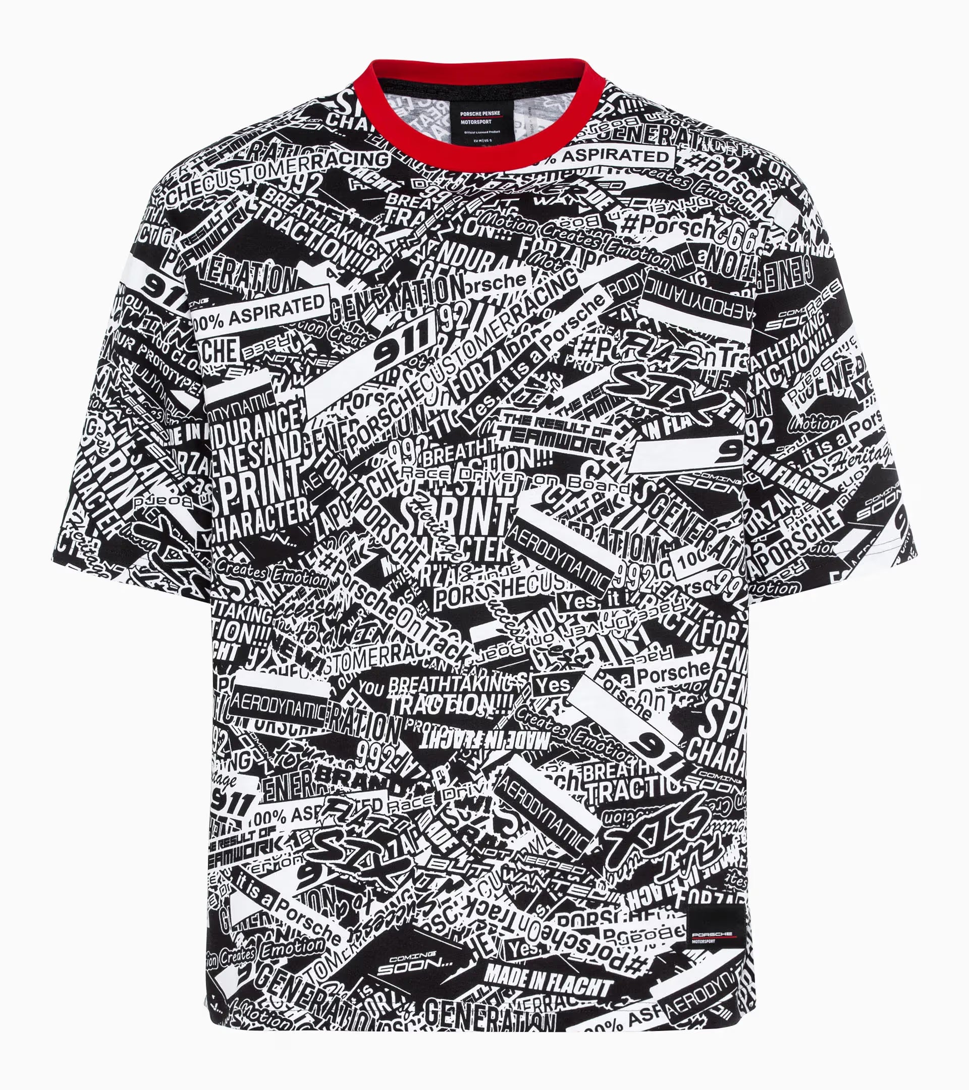 Le T-shirt unisexe en 100 % coton biologique avec col contrasté attire tous les regards avec son imprimé all-over, inspiré du revêtement camouflage de la 911 GT3 R (992). La coupe légèrement oversize souligne le look sportif du T-shirt.